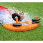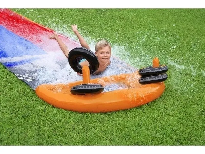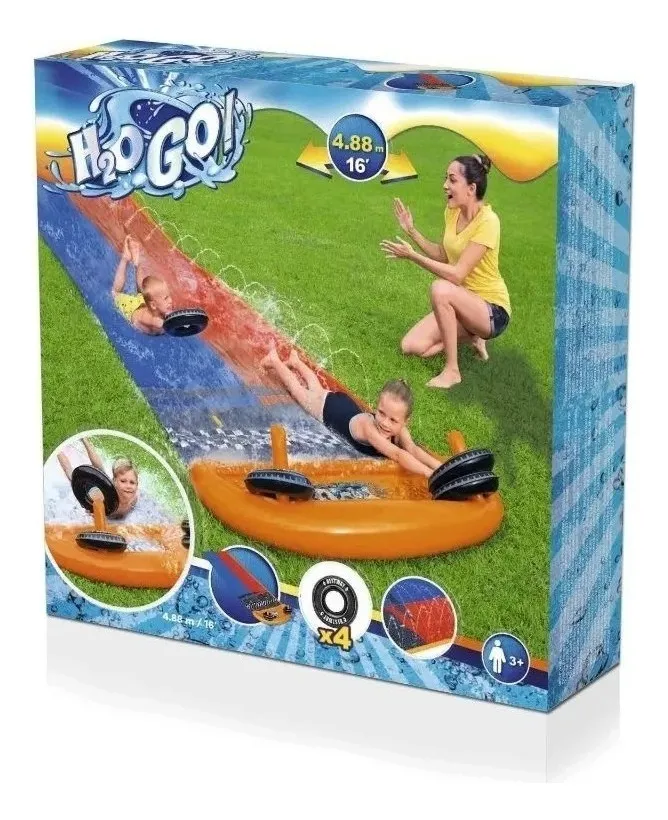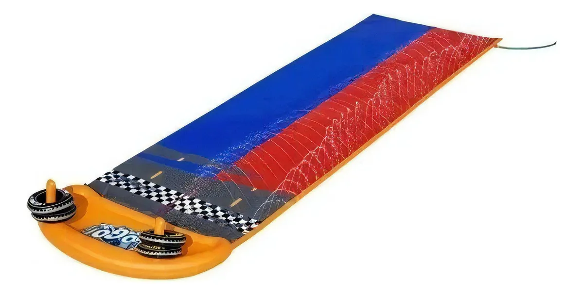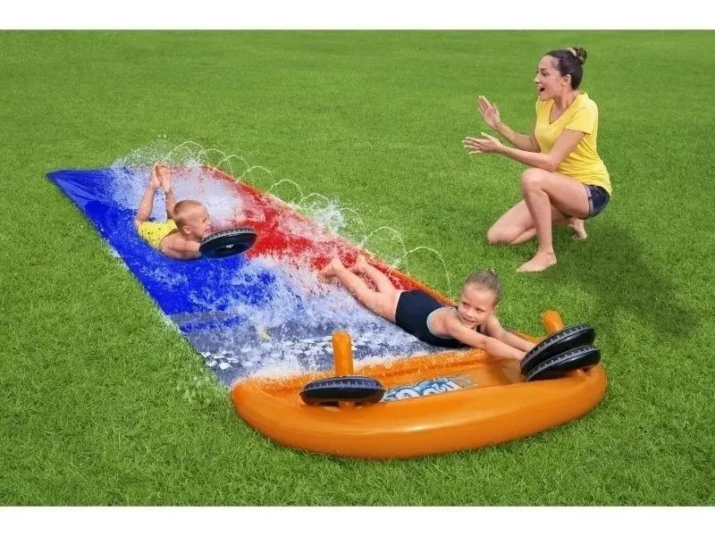 Tobogán doble para hacer carreras con otro amigo hacia un refrescante chapuzón. Conectar a una manguera de jardín y listo.