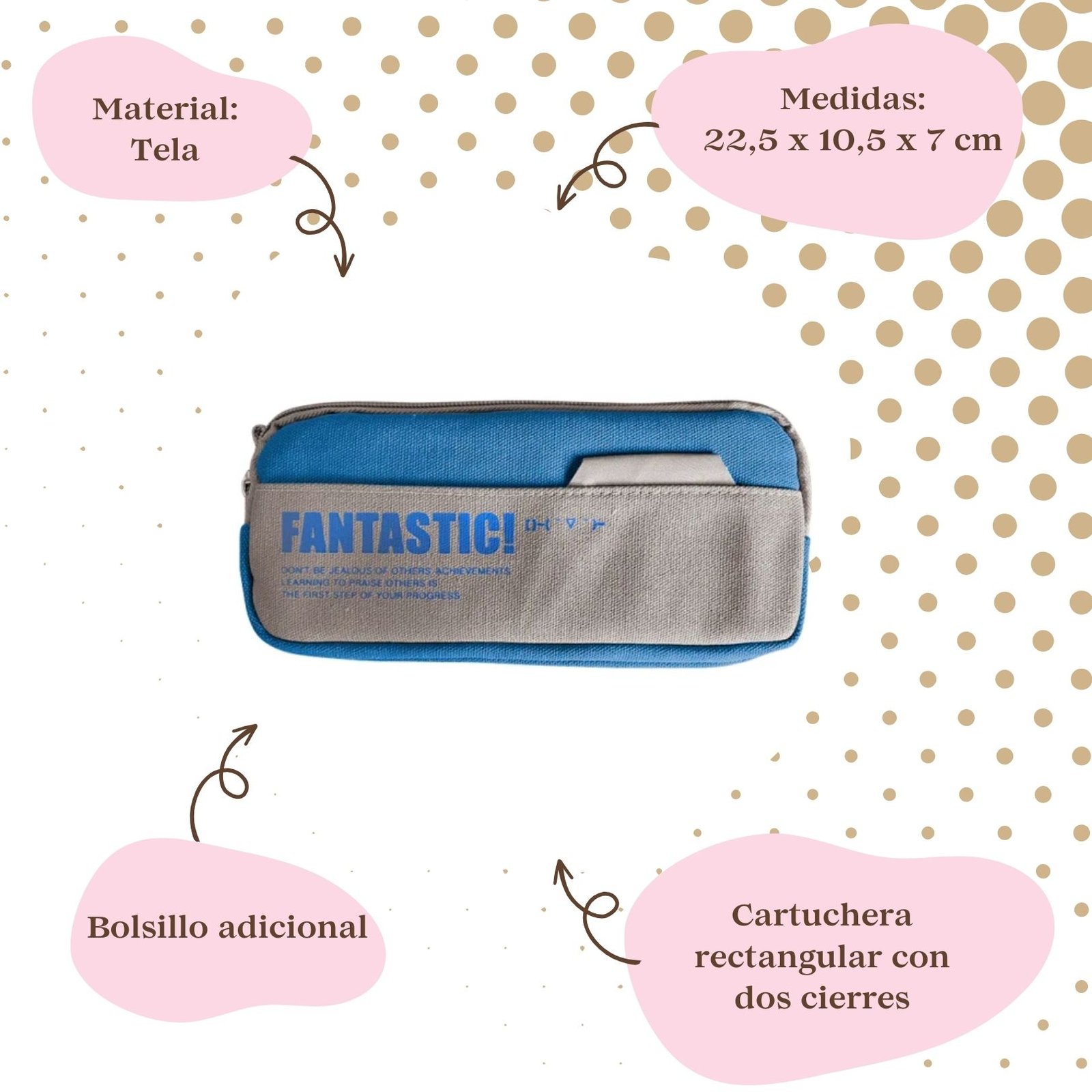 – Diseño rectangular con dos cierres: mayor capacidad y organización para tus accesorios escolares o de oficina.