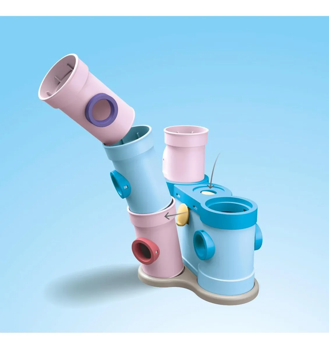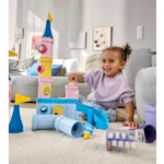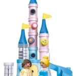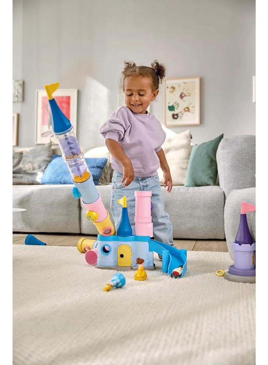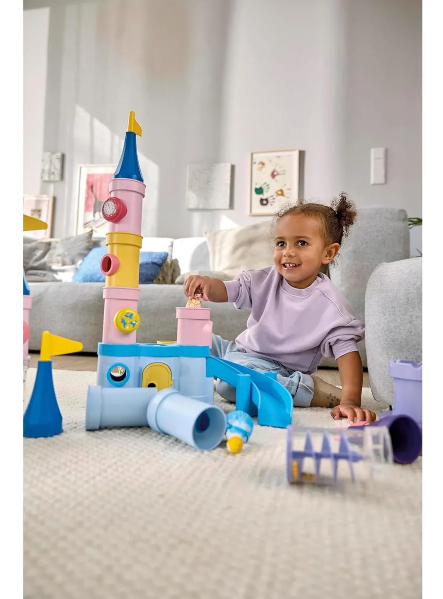 DESCRIPCIÓN – Base del castillo con botón de deslizamiento. – Tobogán con dos ranuras para barrera de banderas. – Seis torres de apilamiento con ventanas y marcos de ventanas de colores. – Cuatro tapas de ventana apilables para clasificar por colores Dos torres de descubrimiento con diferentes transparencias para observar las bolas y hacer sonidos. – Tres tejados, cada uno con una ranura para una de las tres banderas. – Cenicienta con falda extensible y función giratoria. – Todas las torres y tejados son combinables.