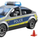 FIGURAS – 1 policía con gorra; Accesorios: 1 coche patrulla con módulo de luz y sonido, 1 funda con pistola, 1 chaleco de alta visibilidad, 1 cámara, 1 cuaderno, 1 pala de policía, 1 mancha de aceite, 2 conos de tráfico.