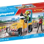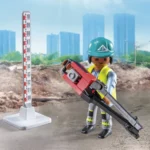 FIGURAS – 2 hombres con cascos de construcción; Accesorios: 1 rodillo, 2 barreras de tráfico con luces intermitentes amarillas, 1 medidor láser, 1 vara de medir, 2 cuñas, 1 pala, 1 escoba, 1 chaleco de seguridad, 1 bloc de notas.