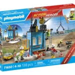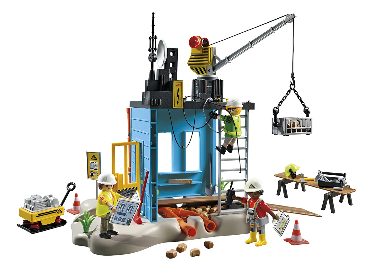 Construcción con grúa de gran tamaño y edificio fabricado por Playmobil, el juego ideal para todo momento con la temática preferida de los más chicos.
