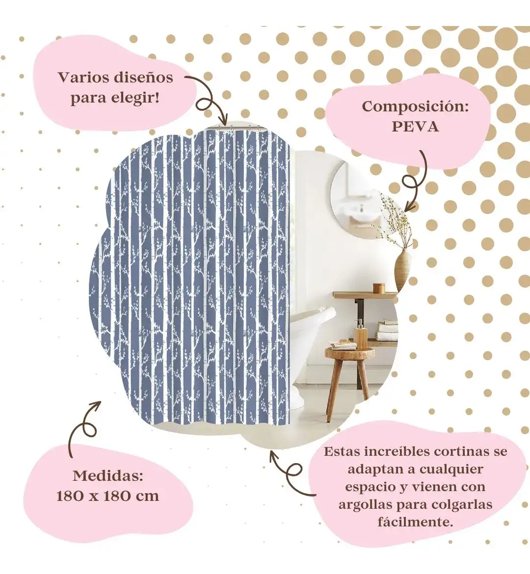 – Composición: PEVA, una alternativa eco-friendly a las cortinas de ducha tradicionales y sin efectos nocivos para nuestra salud.