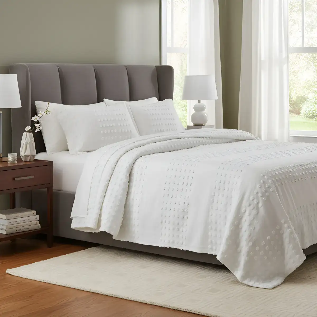 Colcha adulto confeccionada por Richmond 100% poliéster, diseño Nordico con pompón. Disponible en 3 colores: Beige, Gris y Blanco.