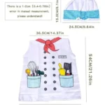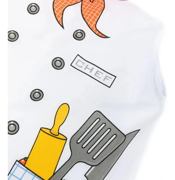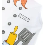 Chaleco estampado: en color blanco con diseño impreso que simula una chaqueta de chef profesional. Incluye detalles como botones negros al frente, un pañuelo naranja en el cuello y bolsillos con utensilios de cocina ilustrados (batidor, espátula, cuchara, verduras, etc.), lo que lo hace llamativo y práctico al mismo tiempo.