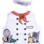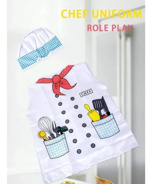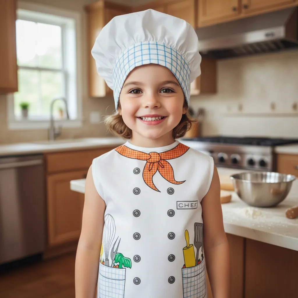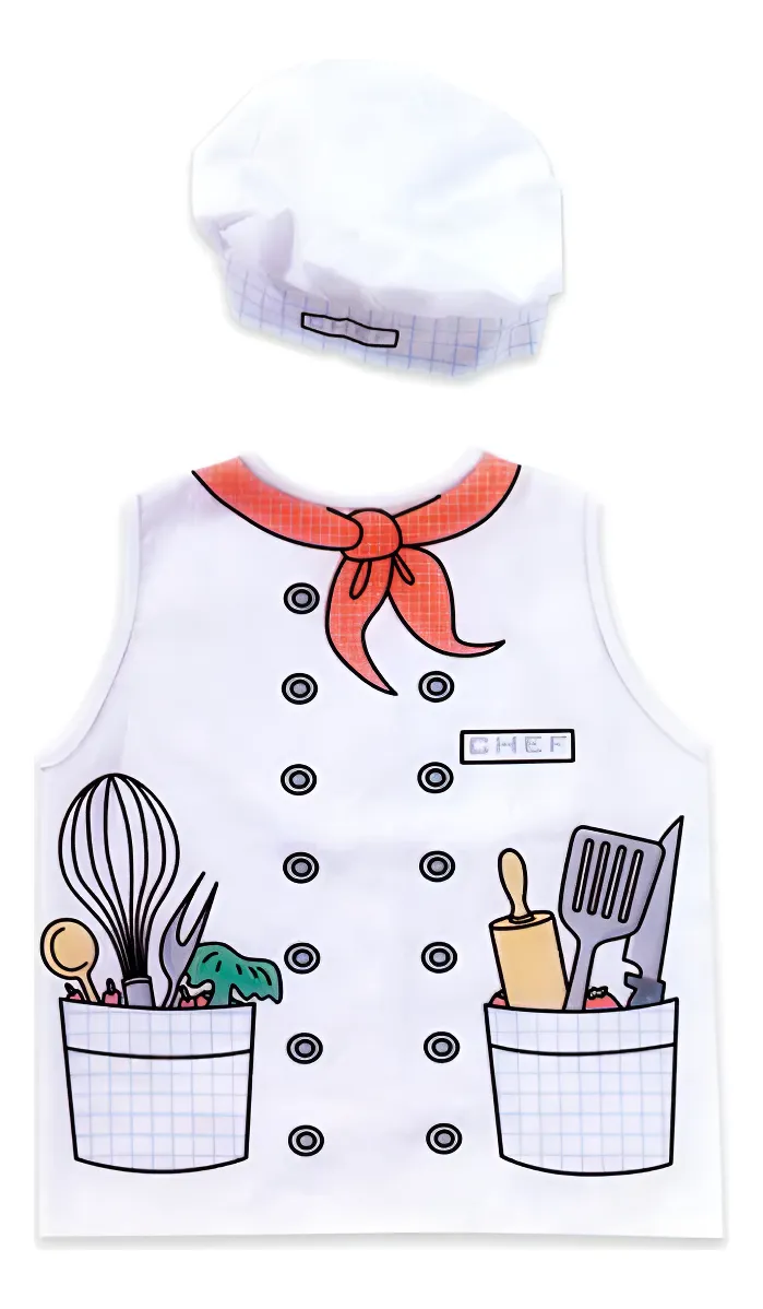 Es un disfraz ligero, cómodo y fácil de poner, perfecto para que los niños jueguen a ser pequeños cocineros mientras desarrollan su imaginación.