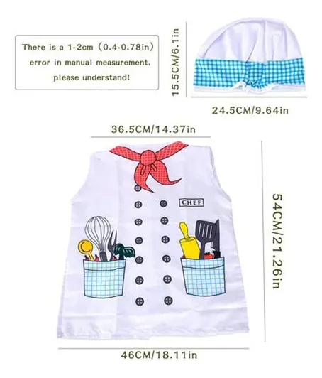 Un divertido disfraz de chef pensado para los más pequeños, ideal para juegos de rol, fiestas de disfraces o actos escolares. Consta de dos piezas principales: