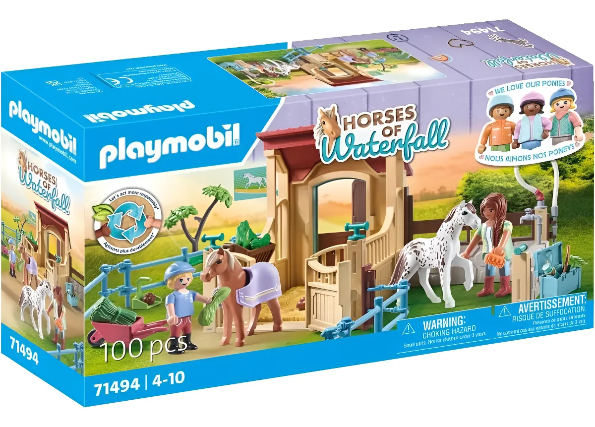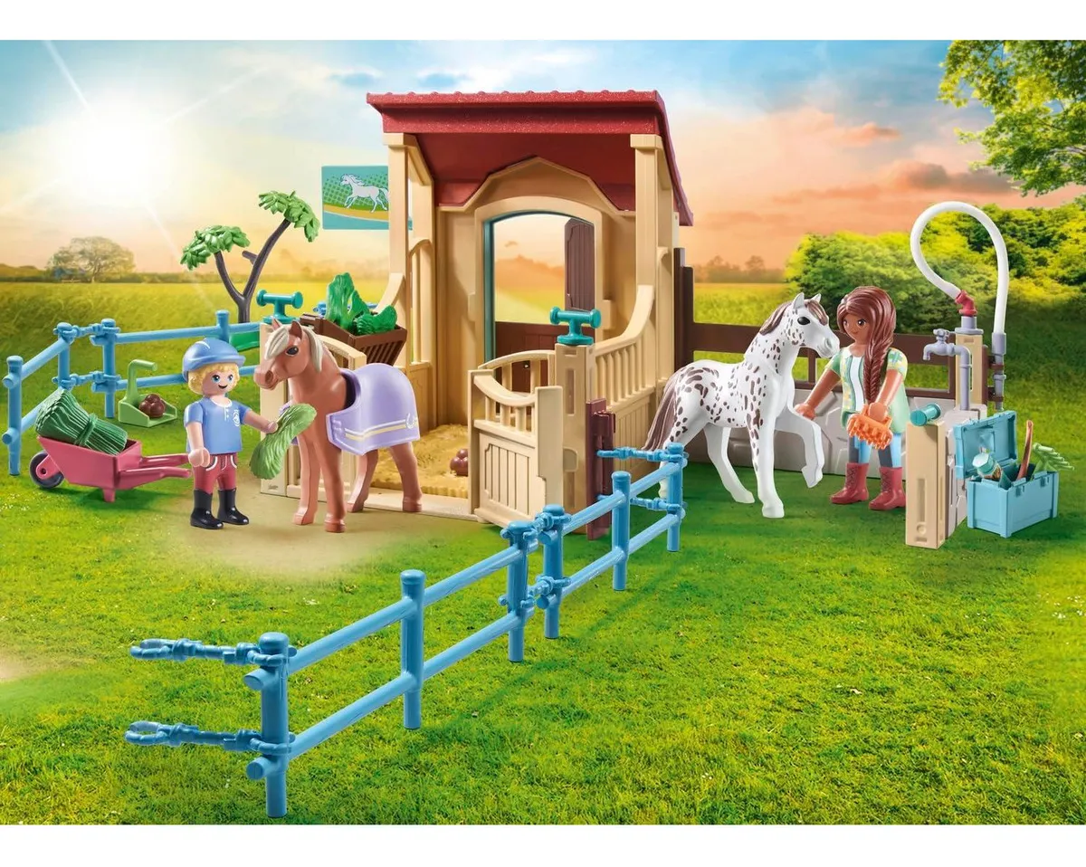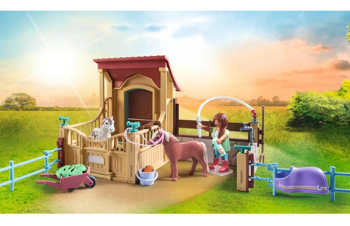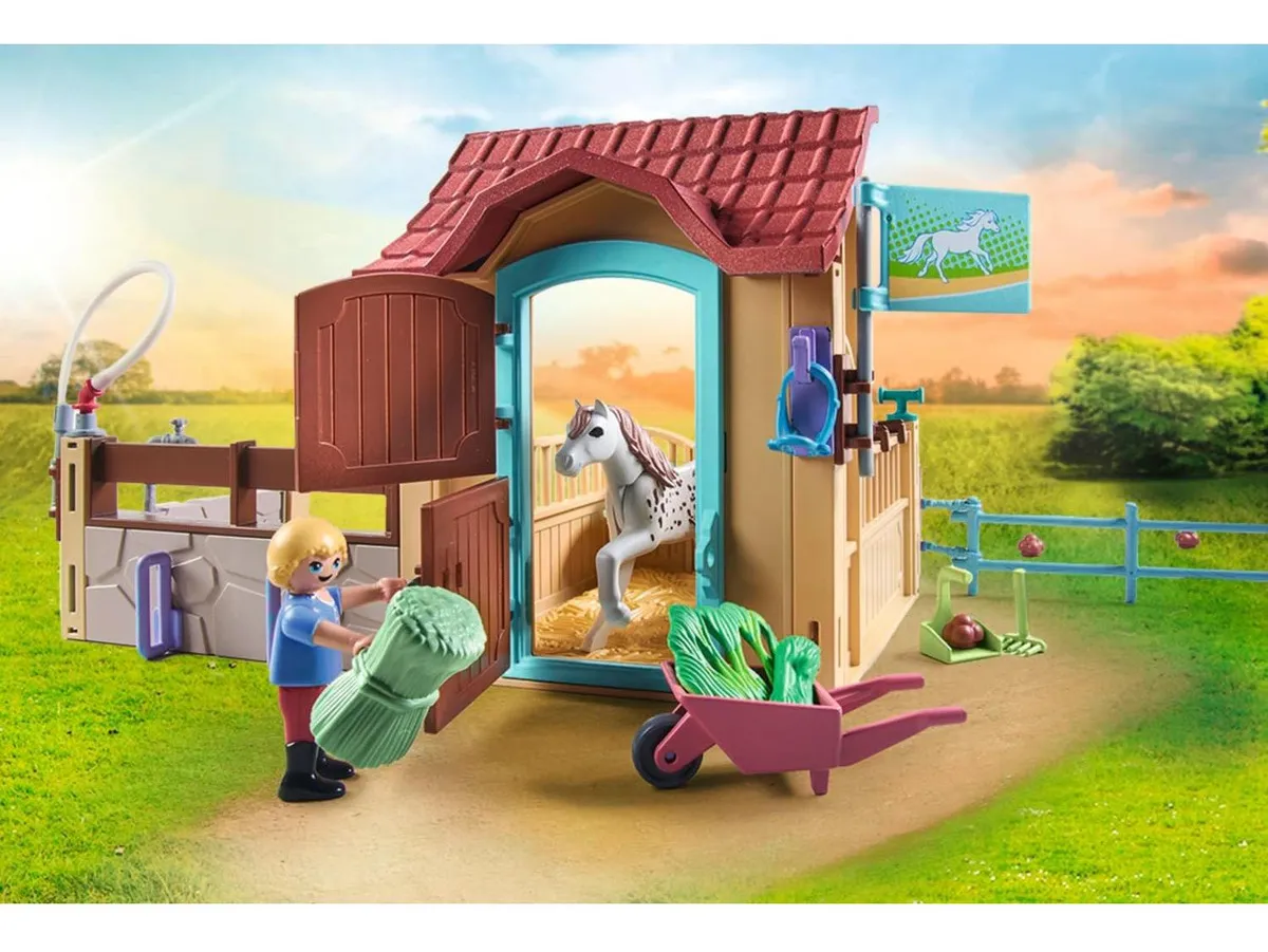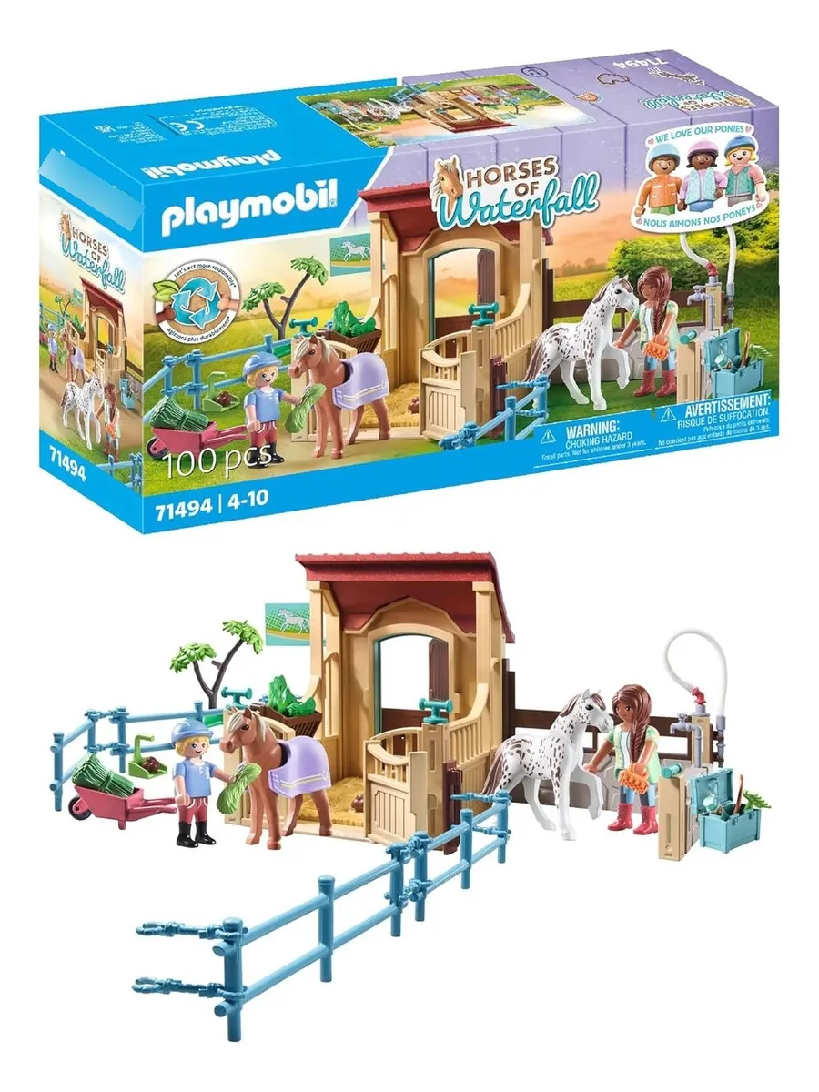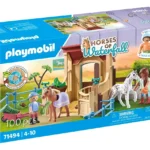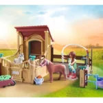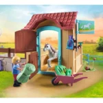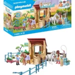 DESCRIPCIÓN – El set incluye un establo PLAYMOBIL con figura PLAYMOBIL, dos ponis, una caja para caballos con área de lavado, elementos de valla y numerosos extras para el cuidado de los caballos. Viene con dos etiquetas en blanco para etiquetar la puerta del establo y la caja para ponis.