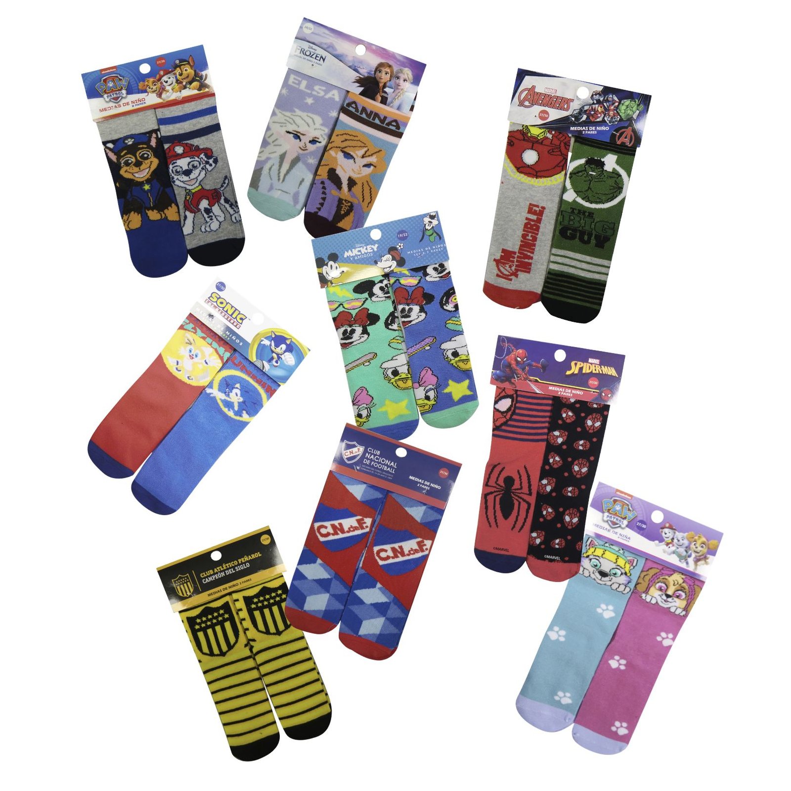 | Color | Avengers, Baby Yoda, Frozen, Mickey y sus Amigos, Nacional, Paw Patrol Azul/Rojo, Paw Patrol Chase y Marshall, Paw Patrol Skye y Everest, Paw Patrol Verde/Rosada, Peñarol, Princesas Disney, Sonic, Spiderman, Star Wars |