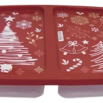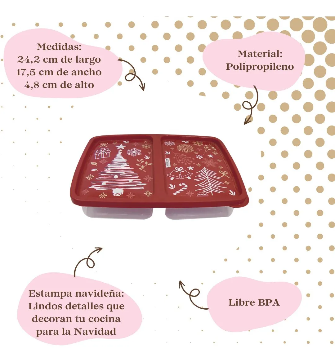 Ideal para las fiestas, este recipiente con diseño navideño tiene dos compartimentos del mismo tamaño, con capacidad total de 1,1 litros. Sus medidas son 24,2 cm de largo x 17,5 cm de ancho x 4,8 cm de alto, perfecto para organizar tus comidas festivas.
