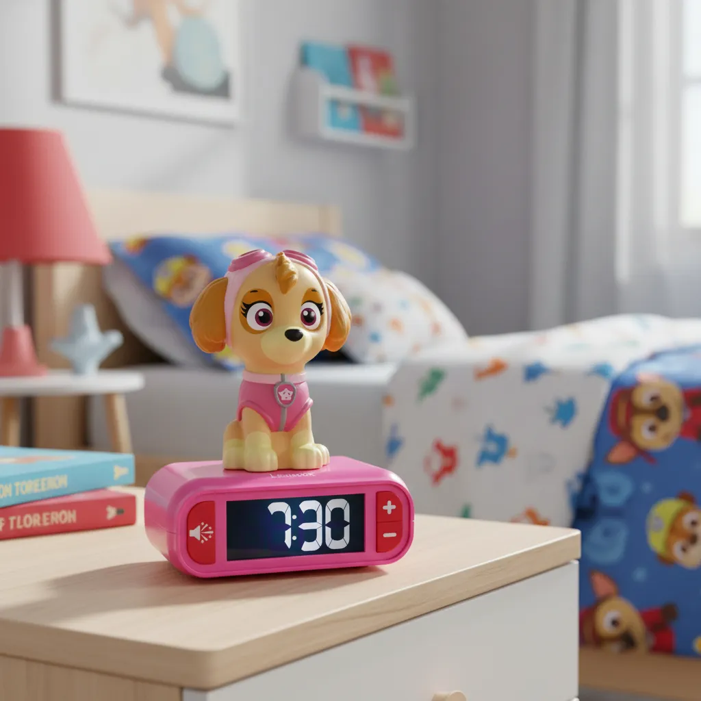 SONIDO – Alarma con volumen ajustable y una selección de tonos de llamada inspirados en Paw Patrol. Perfecto para despertarse sin problemas.