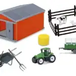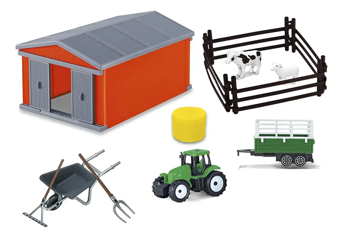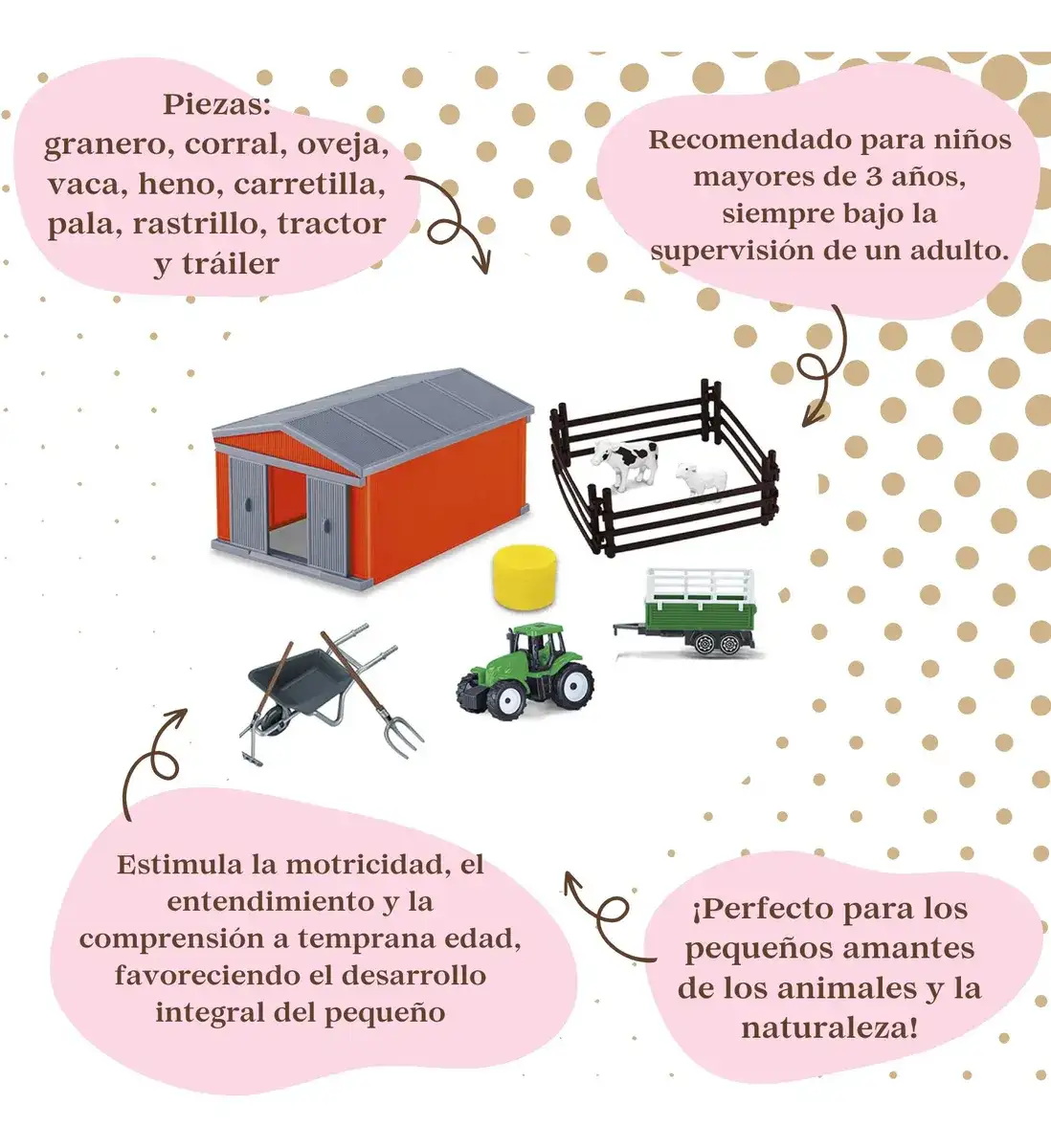 Presentamos un increíble set de granja que incluye 10 accesorios: granero, corral, oveja, vaca, heno, carretilla, pala, rastrillo, tractor y tráiler. ¡Perfecto para los pequeños amantes de los animales y la naturaleza!