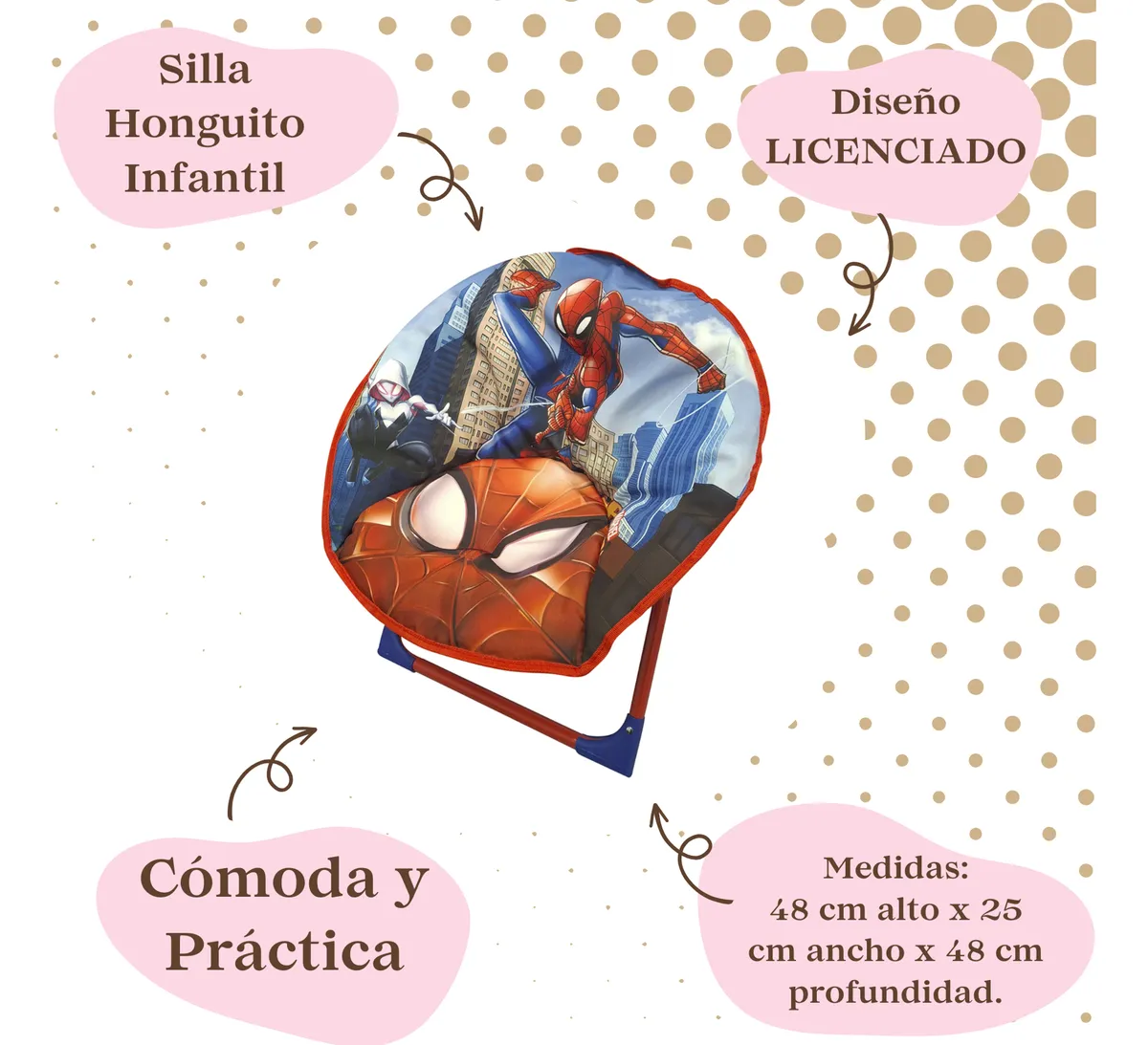 Silla plegable con broche de seguridad, ideal para los pequeños porque no se cierra al sentarse.