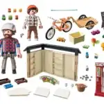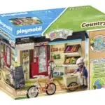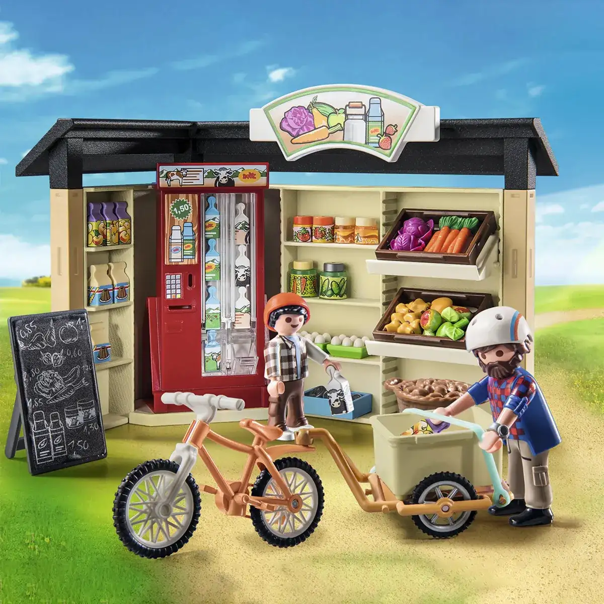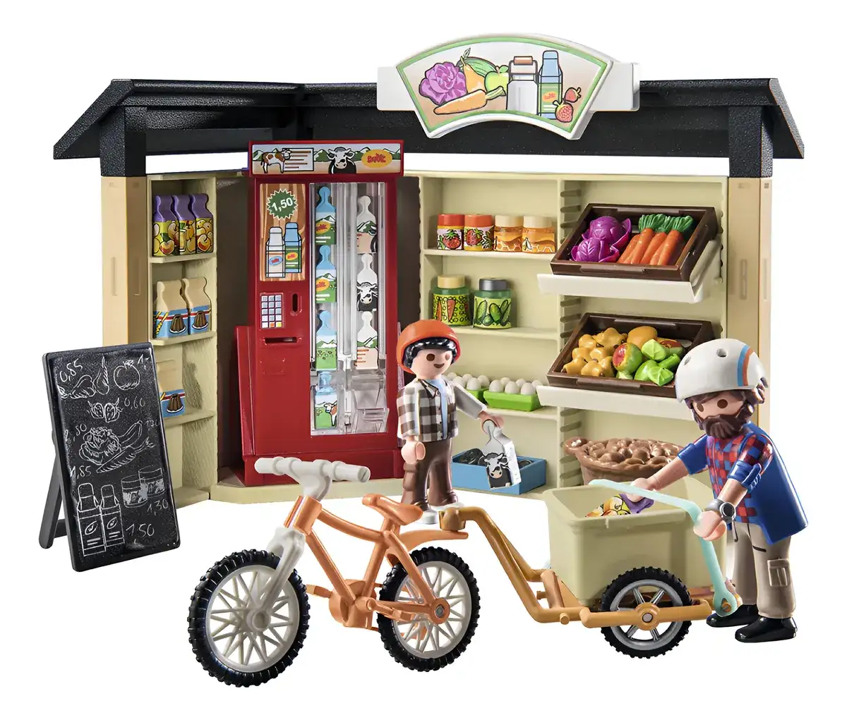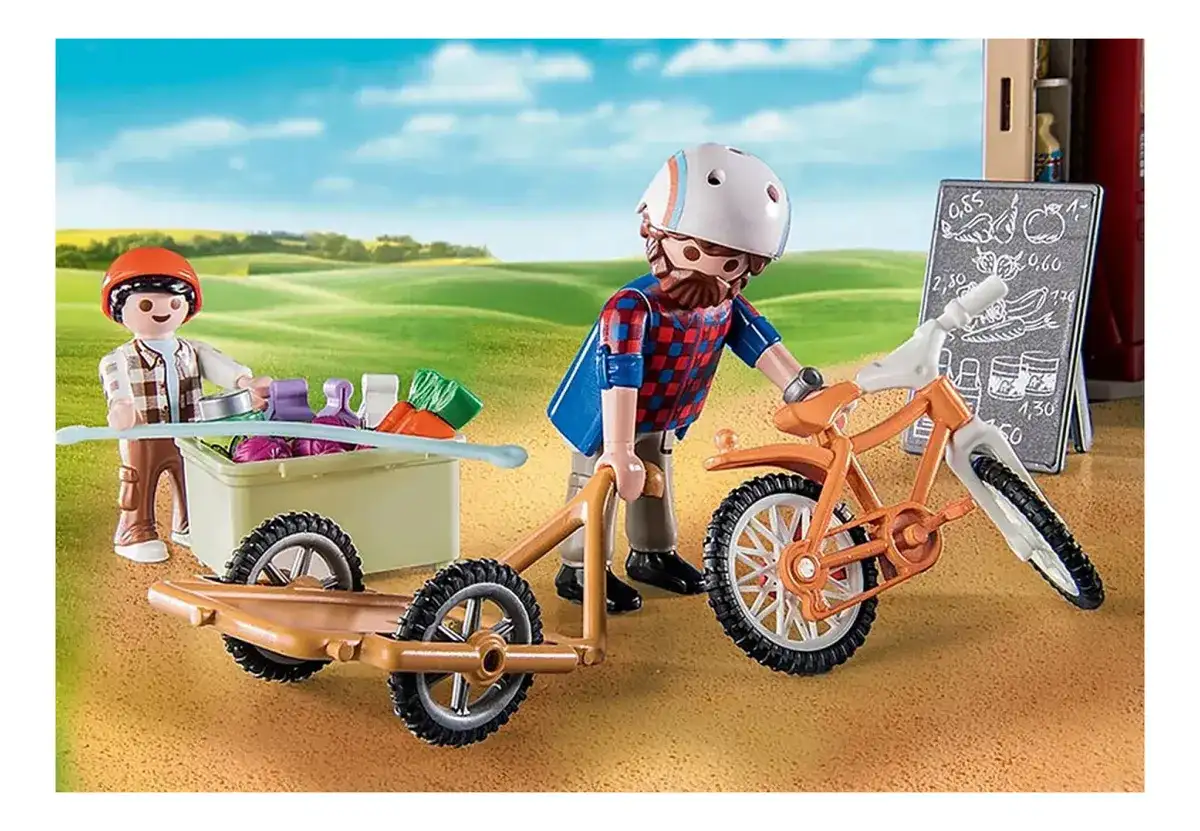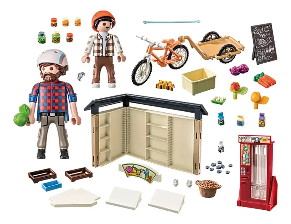 FIGURAS – 1 hombre, 1 niño Accesorios: 1 agrotienda 24 horas, 1 máquina expendedora de leche, 1 bicicleta con remolque, 1 casco de bicicleta, 1 casco de bicicleta infantil, 2 mermeladas de fresa, 2 mieles, 1 pepinillo, 1 verdura en escabeche, 2 6 huevos, 1 cesta de patatas , 8 leches, 4 jugo de manzana, 3 mezclas para pastel, 1 tabla de ofertas, 3 cajas, 1 repollo rojo, 1 zanahoria, 1 manzana.
