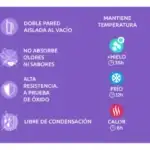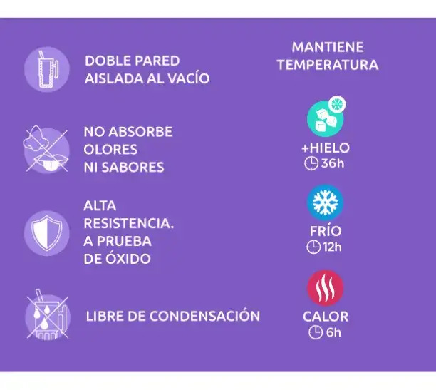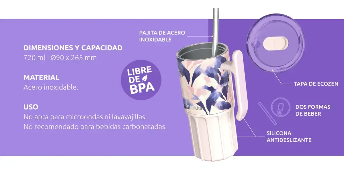 Vaso térmico de acero inoxidable por dentro y silicona antideslizante por fuera. Disponible en varios colores. Con una capacidad máxima de 720ml, con una altura de 26,5 cm x 9,6 cm diámetro. Están hechas con un excelente material que asegura su durabilidad y resistencia, además de estar muy bien diseñadas para ofrecer buen gusto y usabilidad. Tiene boca ancha para cubos de hielo, no absorbe olores ni sabores, doble pared aislante, tiene dos formas de beber (boquilla superior o con la pajita), libre de condensación y cabe en la mayoría de los portavasos de coches. Mantiene: hielo 36 horas / Frió 12 horas / calor 6 horas. Con la compra de una botella Quokka estas colaborando en la construcción de pozos de agua en Etiopía. Quokka se une con la Fundación ADS para Saciar la Sed en el Mundo. *No apto para lavavalijas y microondas, no se recomienda para bebidas carbonatadas*